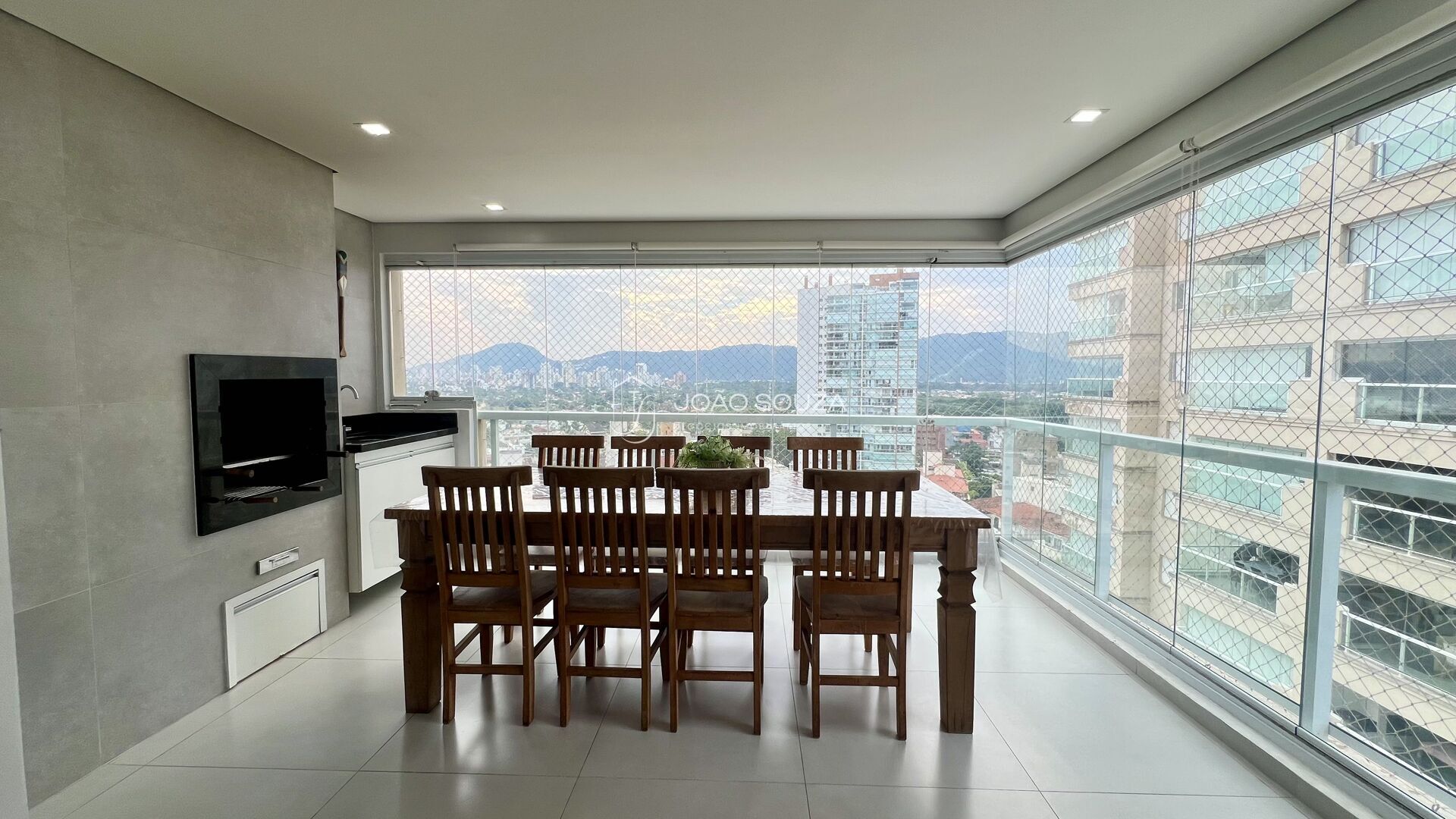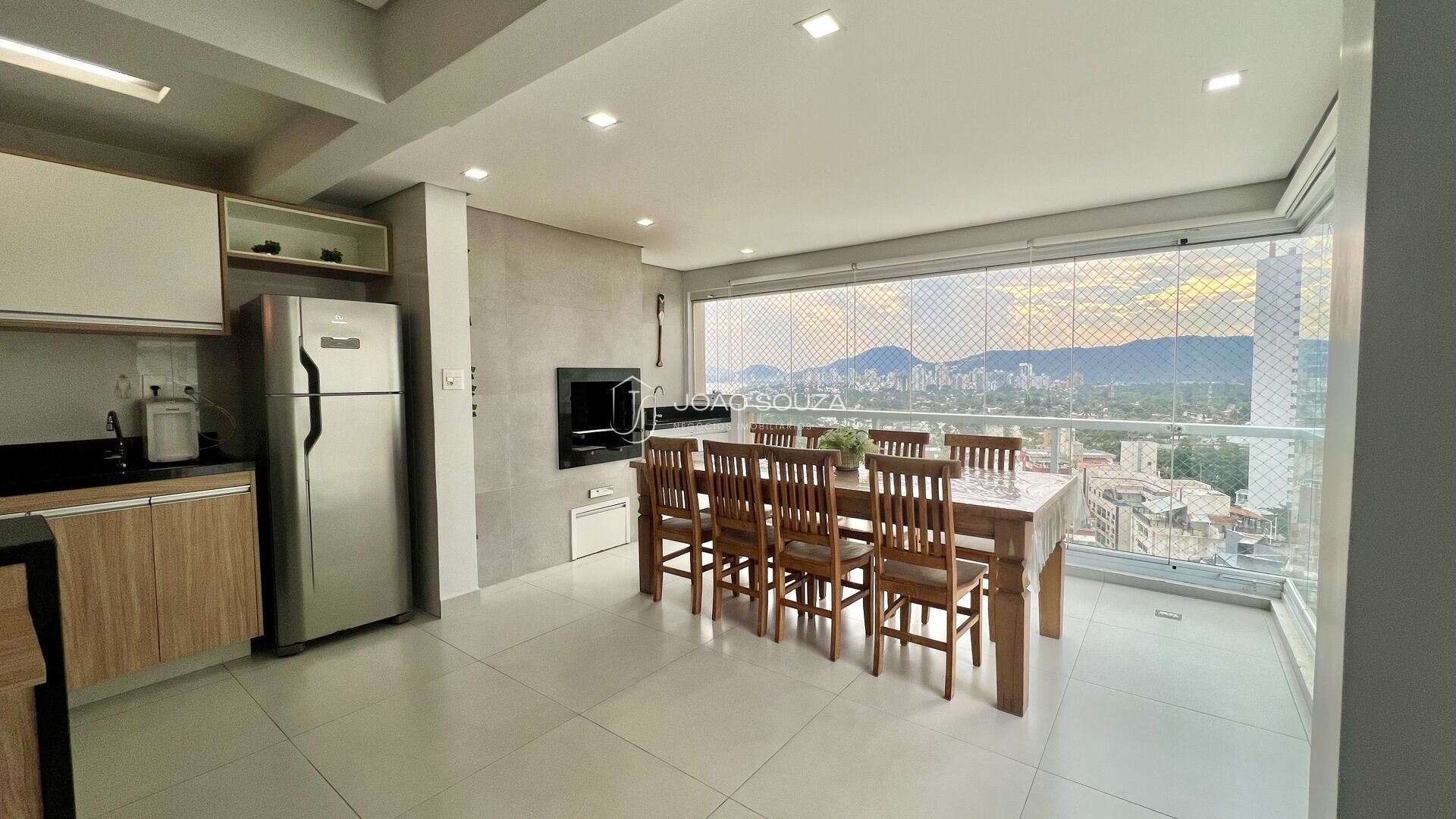 A varanda gourmet com churrasqueira, integrada à sala e cozinha, cria o cenário ideal para receber amigos e família enquanto aproveita a brisa do mar e a vista privilegiada.